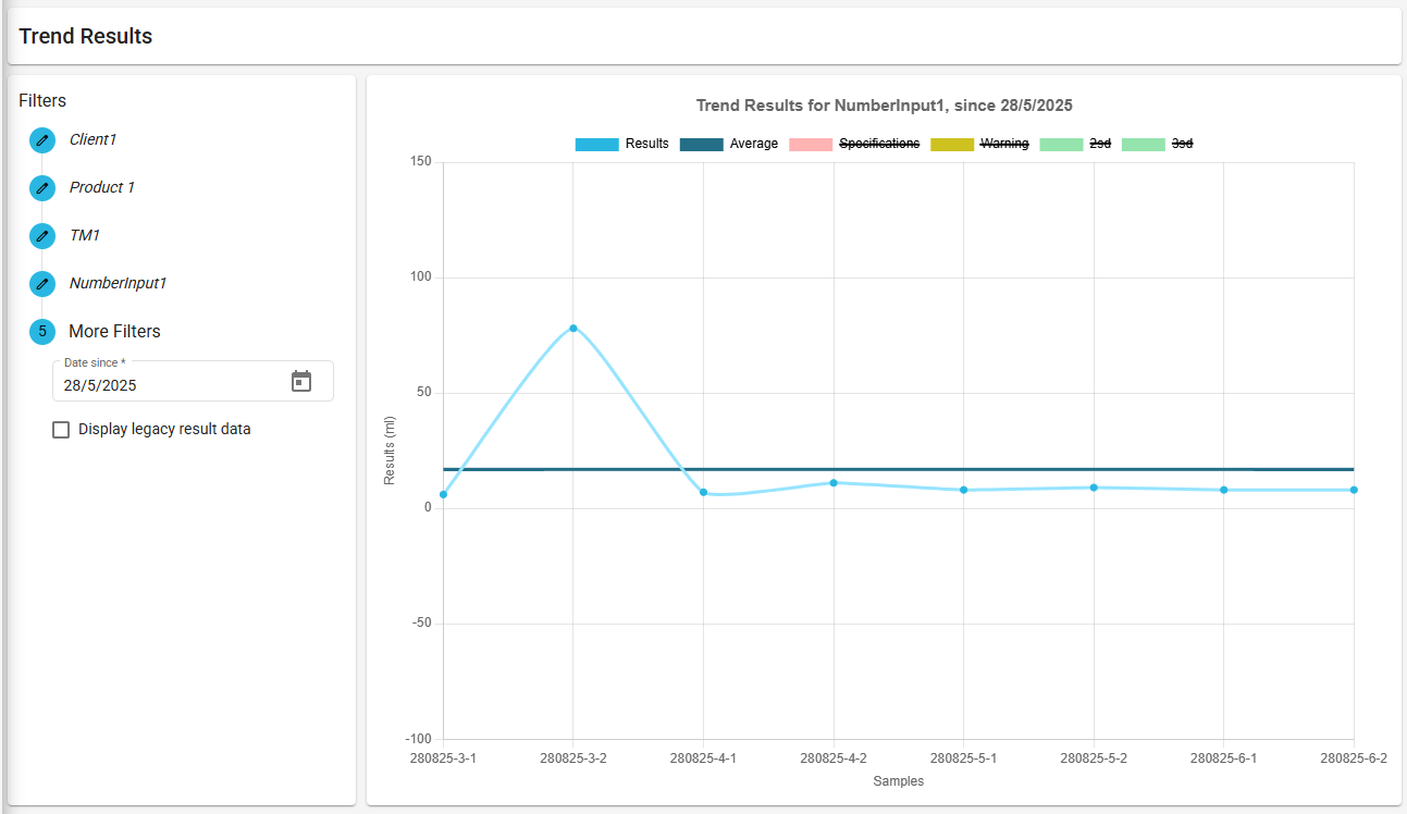 Analysis > Trendfrom the menu. - In the Filters section, select a client, a product, a test method and a test method output.
