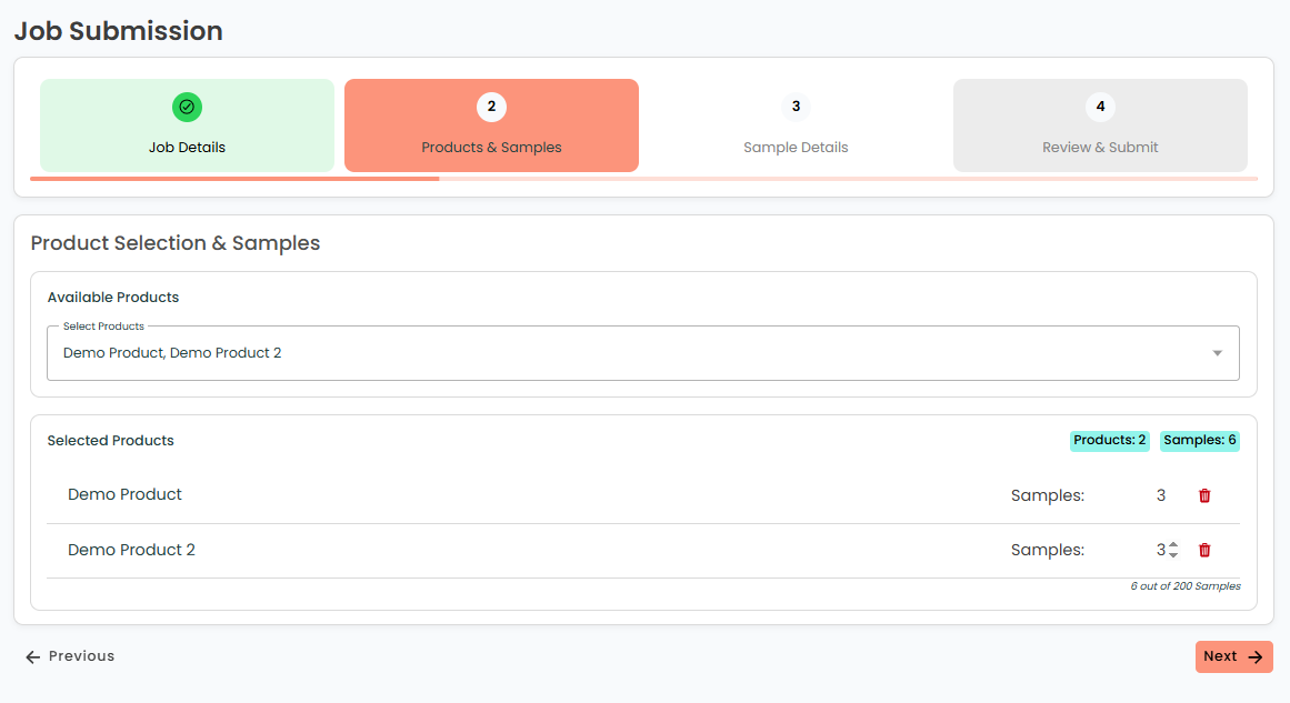 The [Available Products] selector can be used to add one or more products to the job. Once selected, each product appears below in the [Selected Products] display pane. Use the [Sample Number] selector to change the number of samples that require testing. A maximum of 200 samples can be added per product. The [delete] icon can be used to remove the product from the job, should it not be required.