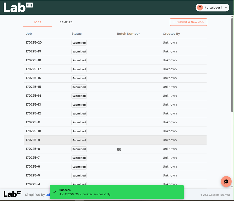 Samples can be submitted for testing via the Portal using the [Submit a New Job] button, located on the Job & Sample Viewer screen.