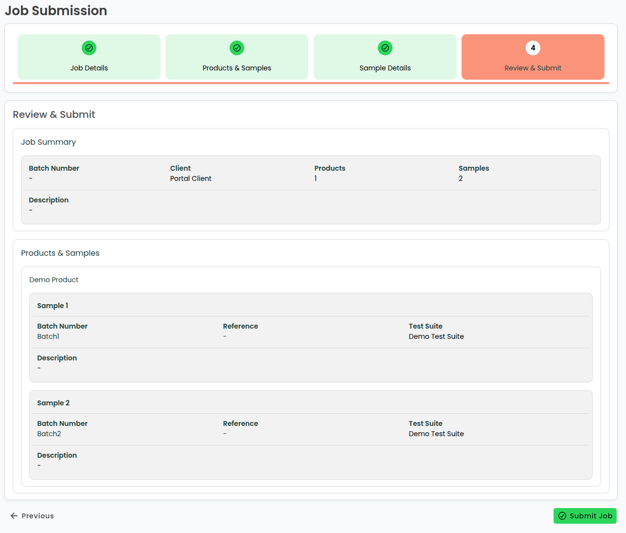 The final step shows a summary of the job you wish to create. The green tiles ([Job Details], [Products & Samples], [Sample Details], and [Review and Submit]) in the wizard's header can be used to go back to amend any details.