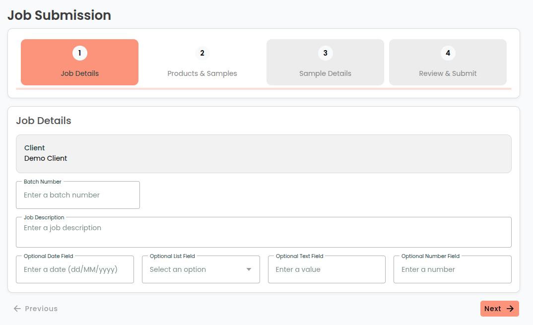 The first step will ask you to enter the job's details. This includes confirming the client, and entering other optional details including job batch number and description .