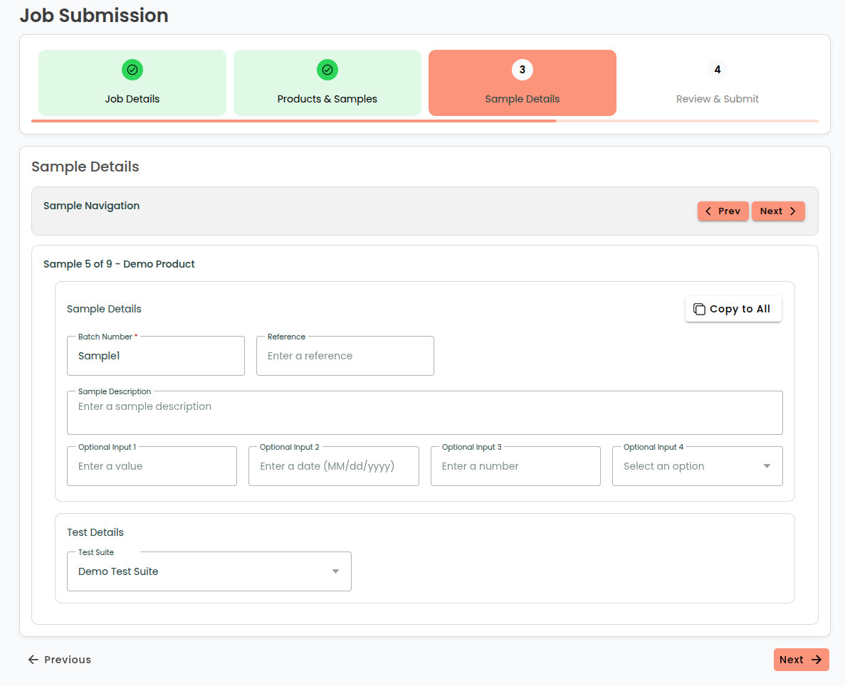 If you have more than one sample, A [Copy to All] button is available to quickly apply the current sample's details to all other samples.
