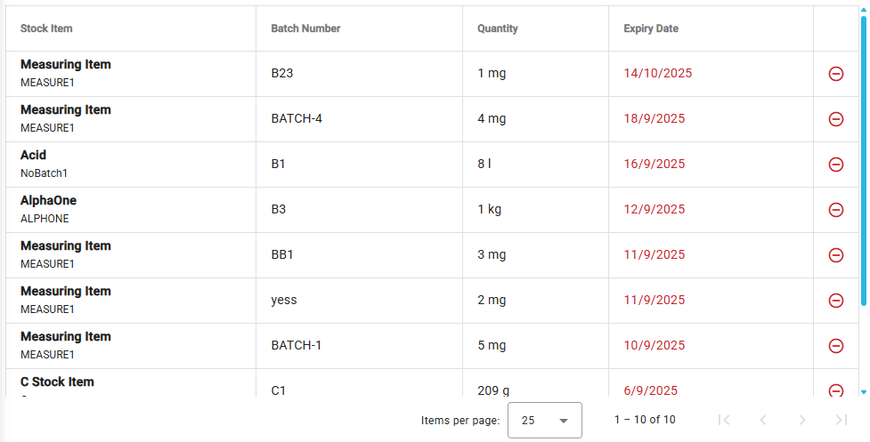Stock batches are displayed in order of most recently expired or soonest-to-expire first. Use the pagination at the bottom of the table to move through pages of records.