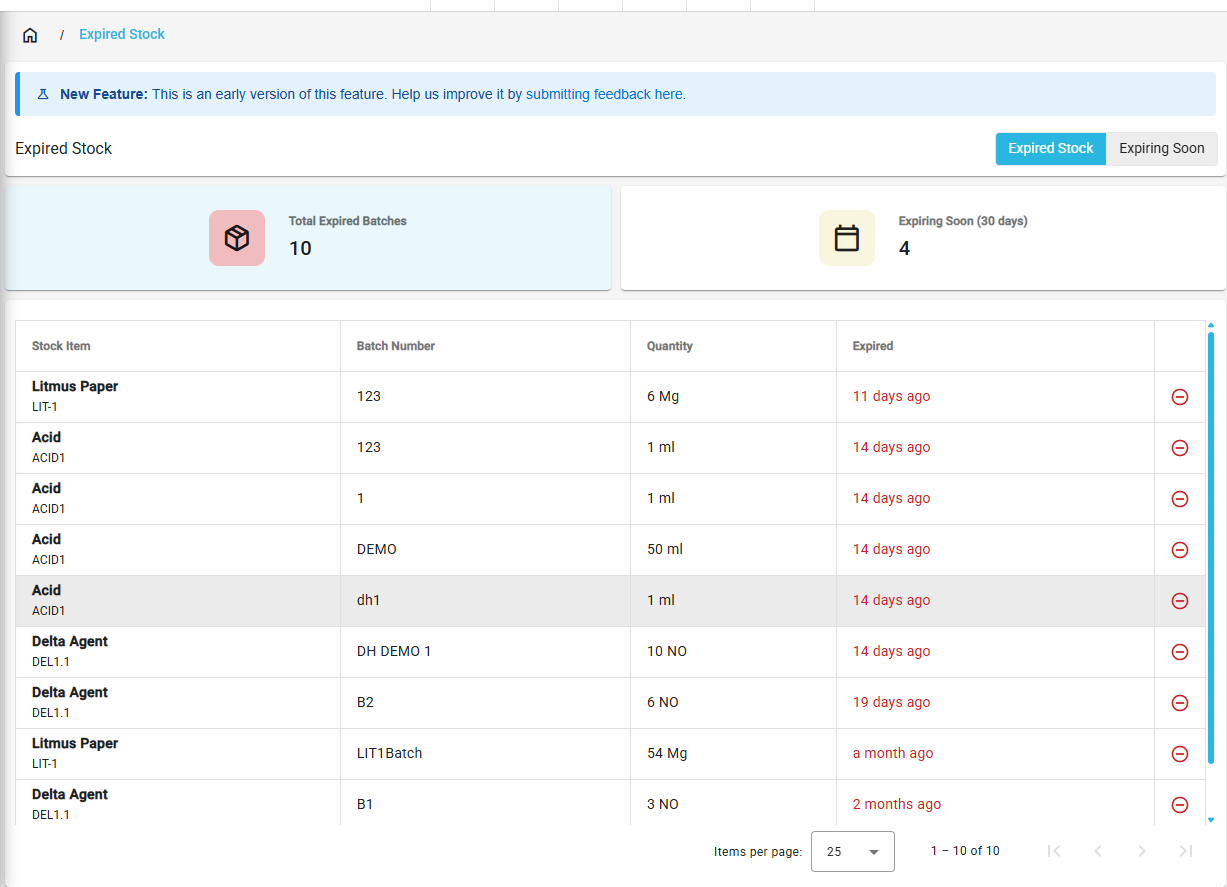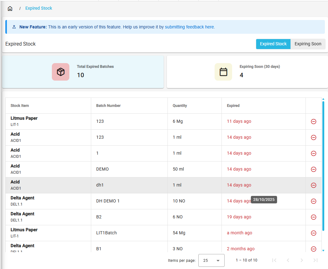 - Expired: Click the Expired button to view stock that has already expired.