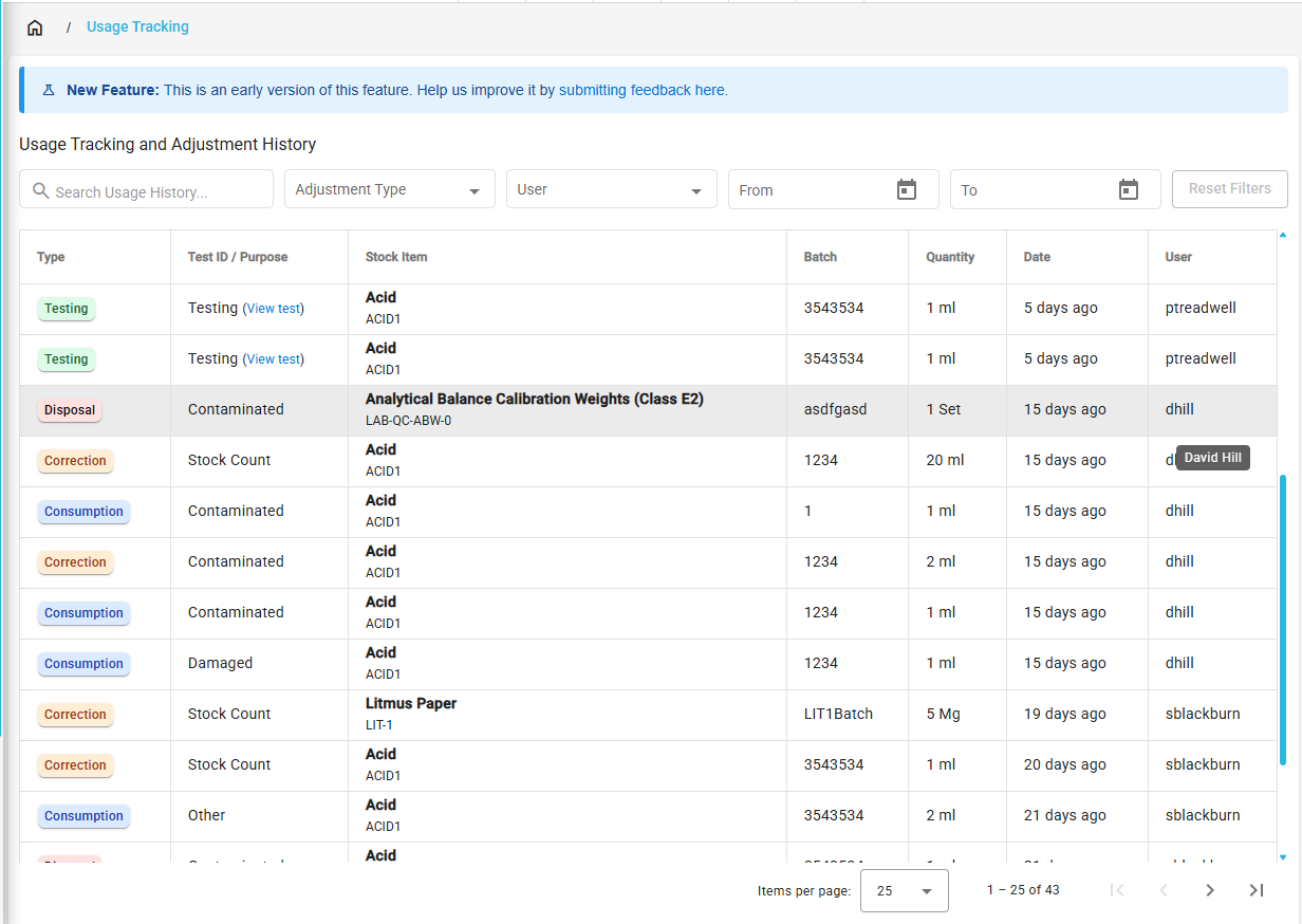 The Usage Tracking screen provides a complete, chronological record of all stock usage within LabHQ. It enables users to review how stock items have been consumed, disposed of, corrected or used for testing. The screen lists all usage entries with most recent displayed first as well as summaries at the top of the screen which show data around wasted stock.