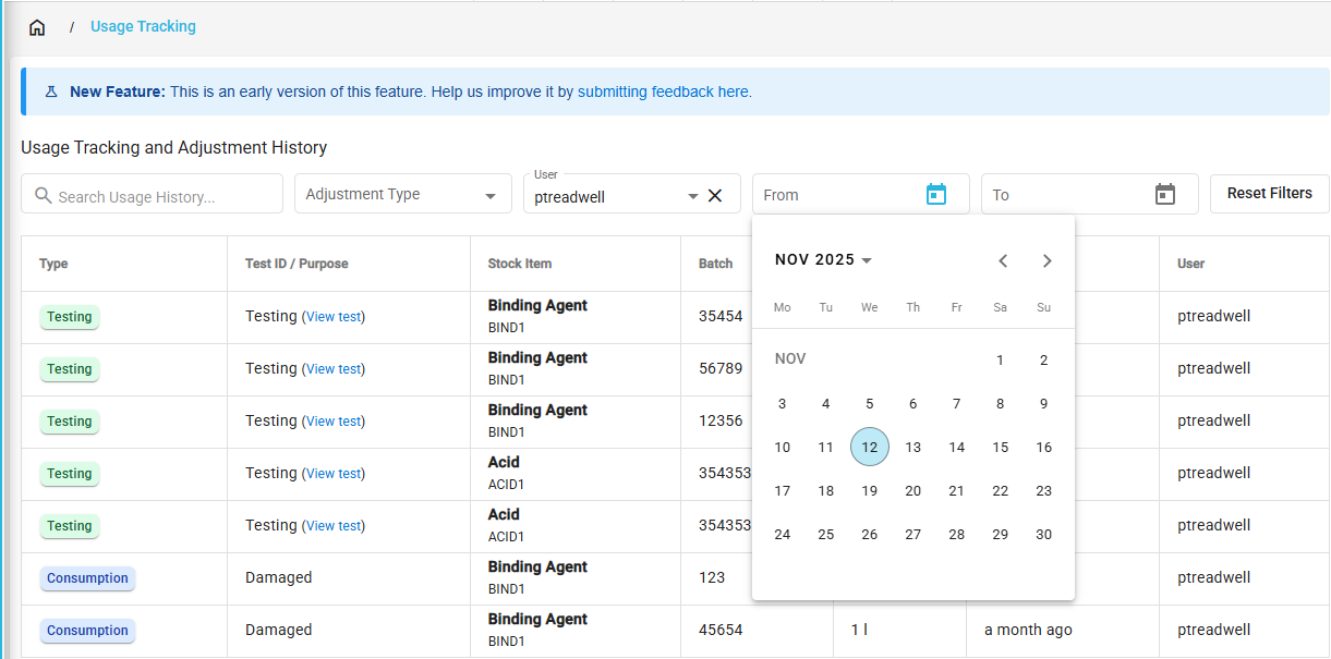 Use the date range selector to display only the stock usage events that occurred within a specified time period. This is helpful for monthly audits, investigations and reconciliation.