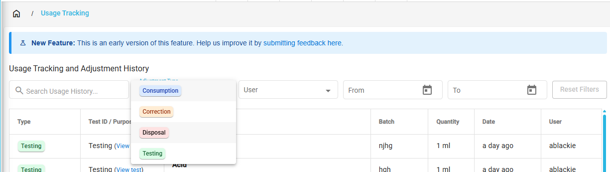 - For non-test usage (disposal, correction or consumption), the system displays the reason entered during the adjustment.