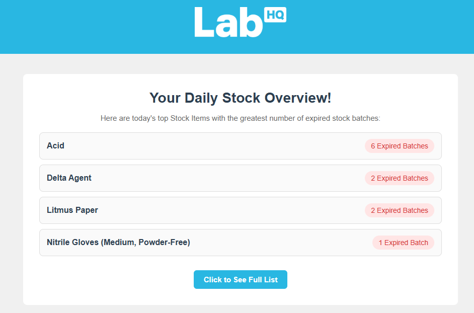 - Top 5 expired stock items - the email lists up to five stock items with the greatest number of expired batches.
