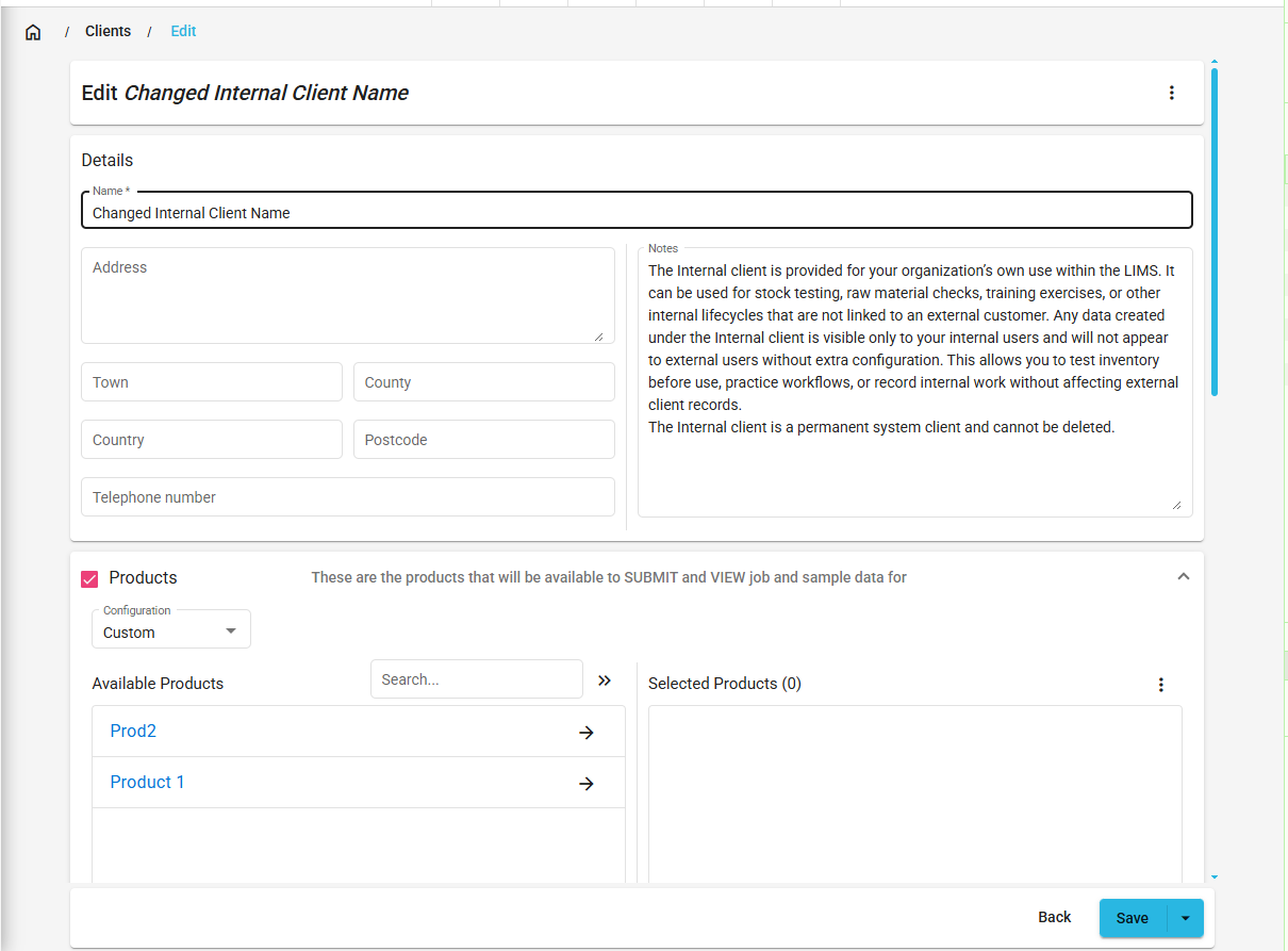 The Internal client is provided for your organization’s own use within the LIMS. It can be used for stock testing, raw material checks, training exercises, or other internal lifecycles that are not linked to an external customer. Any data created under the Internal client is visible only to your internal users and will not appear to external users without extra configuration. This allows you to test inventory before use, practice workflows, or record internal work without affecting external client records.