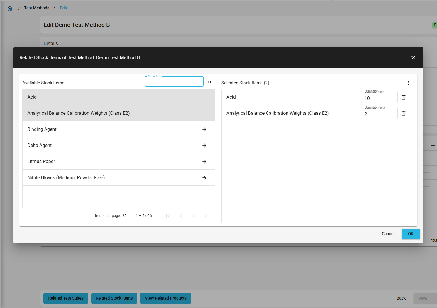 - The Selected Stock Items box will display a list of stock items and their quantities that are associated to the test method.