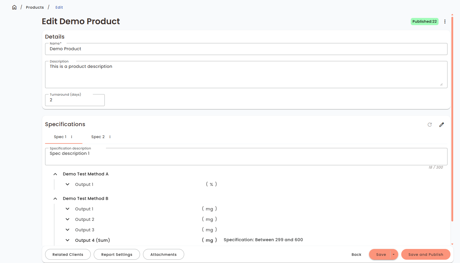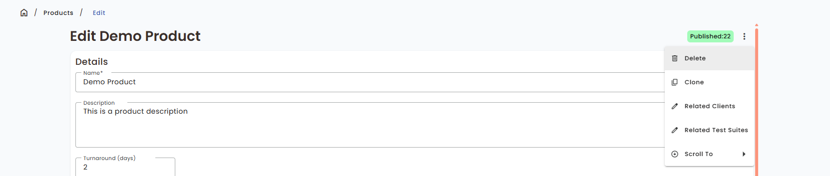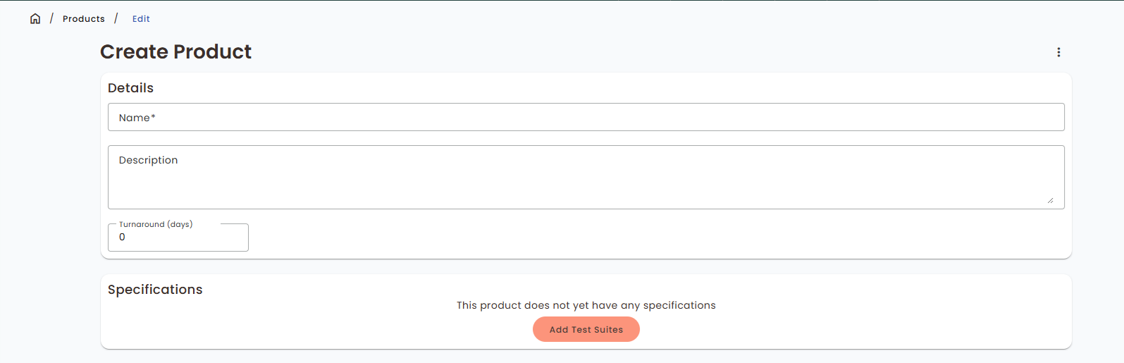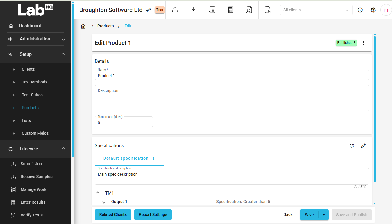 - The product name, description, turnaround, related clients, test suites and specifications can be modified.