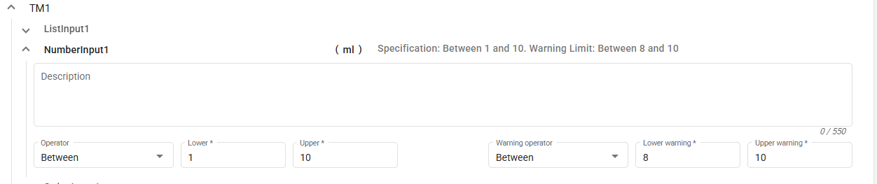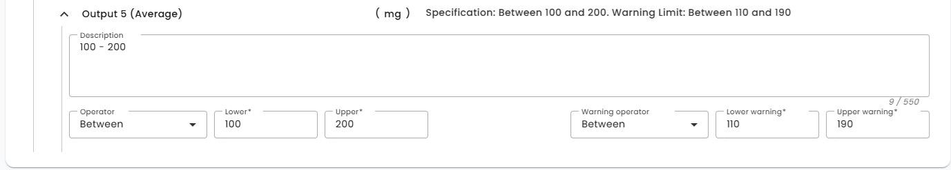 With numeric specifications it is also possible to have a set of warning limits (these are independent of the specification). They work on exactly the same rules as the numeric specifications above, but with the following additional rules: