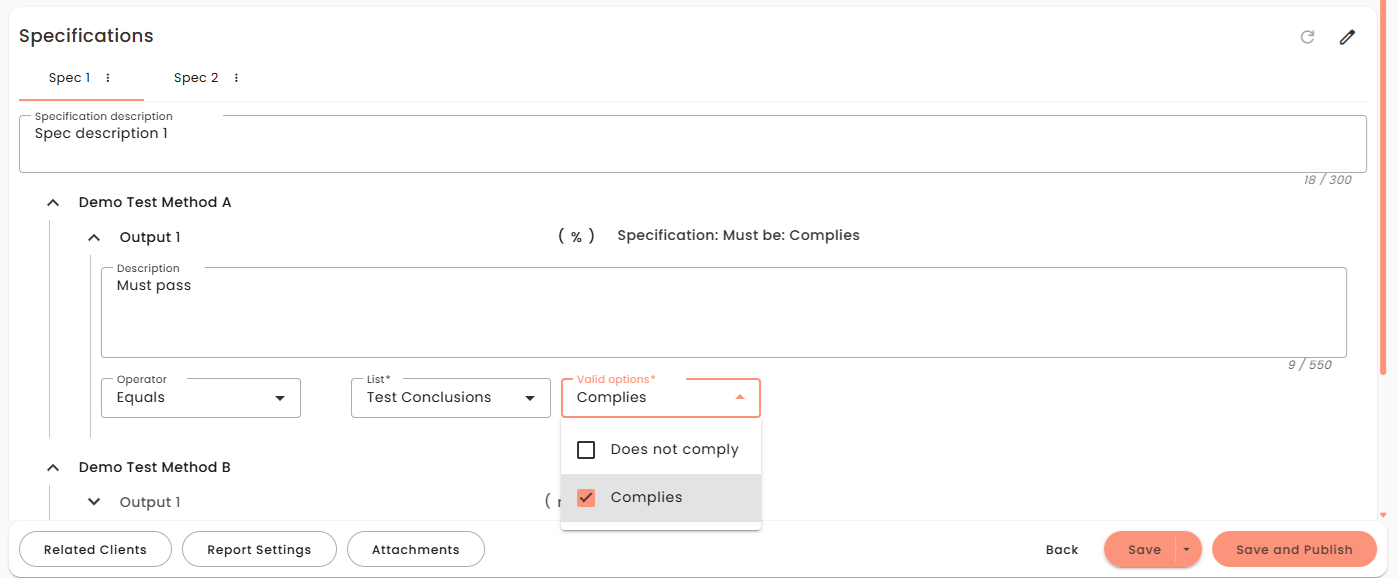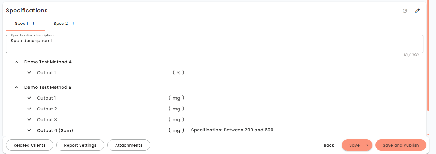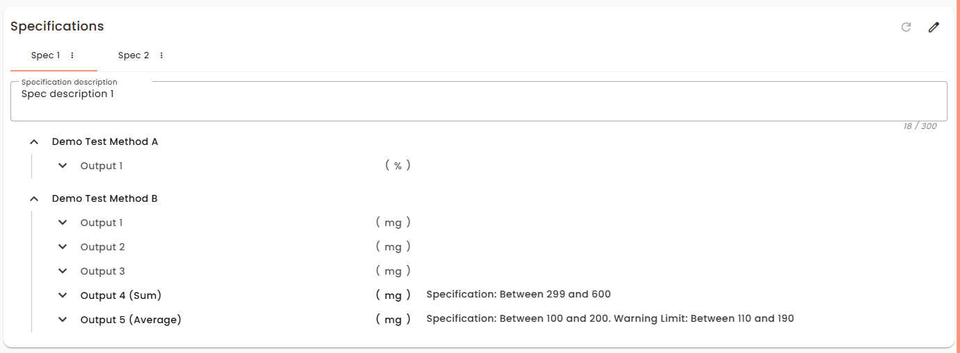 Specifications give you the ability to apply desired limits to values entered on results. These are configured on the Setup > Products > Edit screen using the test method outputs assigned to the test suites on a product. i.e. Product A, has Test suite A assigned to it containing both Test Method A and B. Then you will see both test methods listed on the product edit screen with all their outputs listed within them. Any test methods that are currently in draft will show a 'Draft' label.