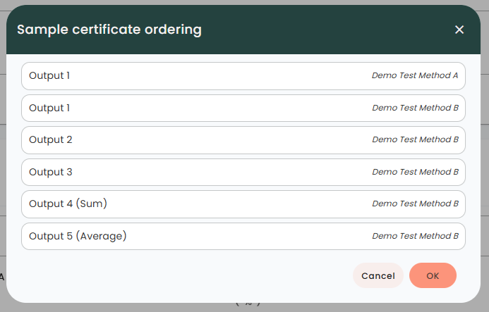ℹ️ The tests that you sort in the Sample Certificate Ordering window may belong to different test suites. If this is the case the order specified will be preserved, with any tests not included in the selected suite skipped.