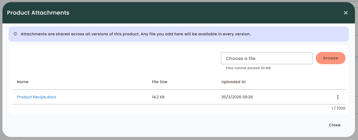 LabHQ allows you to upload and manage attachments for products. Attachments can be used to store supporting documentation such as specifications, SOPs or reference files associated with the product.