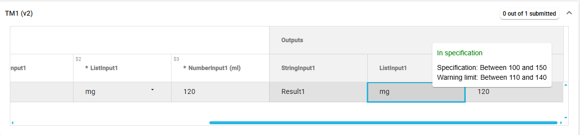 You can view specification limits of any output that has a result by hovering over the cell. A popup will appear displaying a quick summary (pass / fail / out of specification) as well as specification limits, warning limits and the output description.