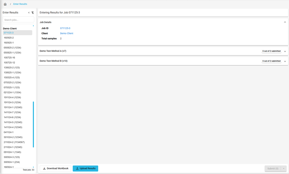 Lifecycle > Enter Resultsmenu from the sidebar or click on the [ Enter Results ] icon in the header. - Click on a job in the left list to load the job details. Jobs will be grouped by client if you have more than one client associated with your user account.