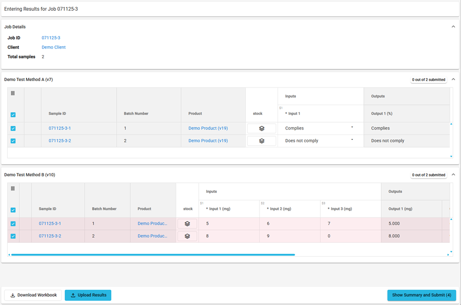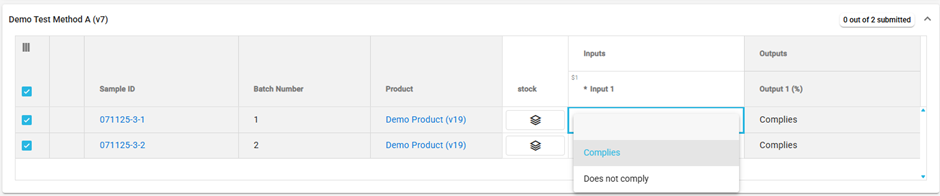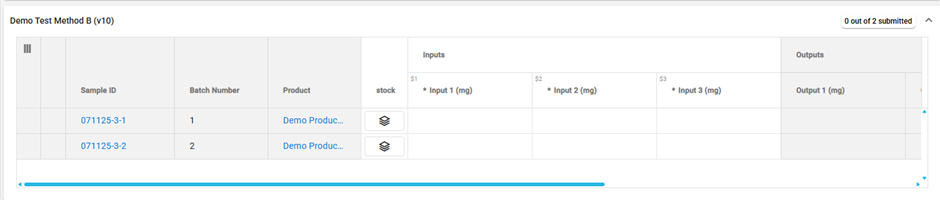 Samples at enter results are grouped by test method. Each grid row is a sample test and consists of the sample identifier, the sample’s batch number, the sample’s product and its inputs and outputs.