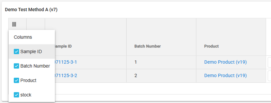 It is possible to show and hide some columns using the three vertical lines icon located to the top left of each test method grid.