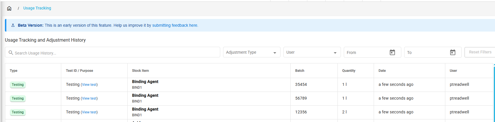 Stock consumption recorded through enter results will be stored as type 'Testing' on the usage tracking screen.