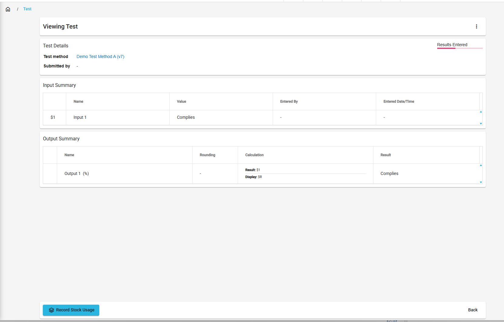 Once all inputs for an output have had a value entered, the output will calculate using the result calculation defined on the test method output.
