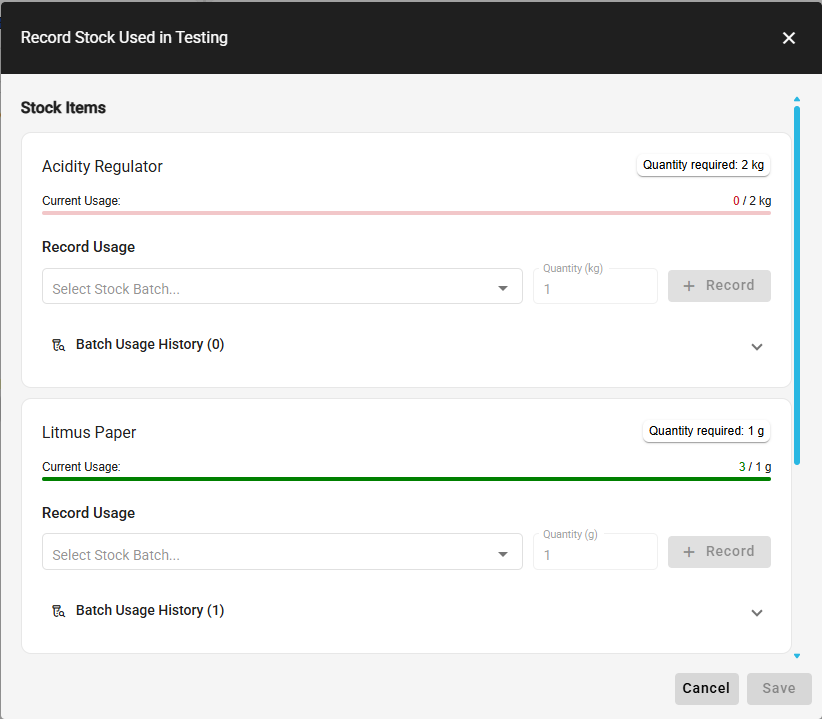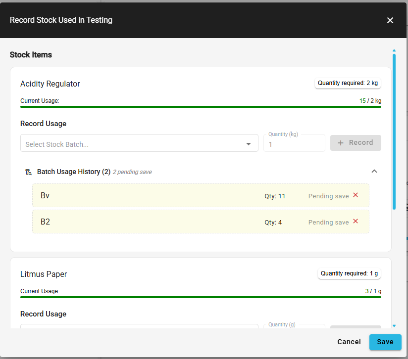 Clicking the [Save] button will confirm any pending usage, reducing the stock batch quantities. Use the cross icon at the end of the row to remove these if they are no longer required. Saving after using the cross icon will replenish the stock batch quantities, making these available for use in other tests. The 'Current Usage' progress bar indicates the progress made towards recording the required amount. Pending stock usage can be saved at any point, up to the 'Quantity required' amount.