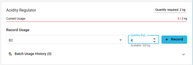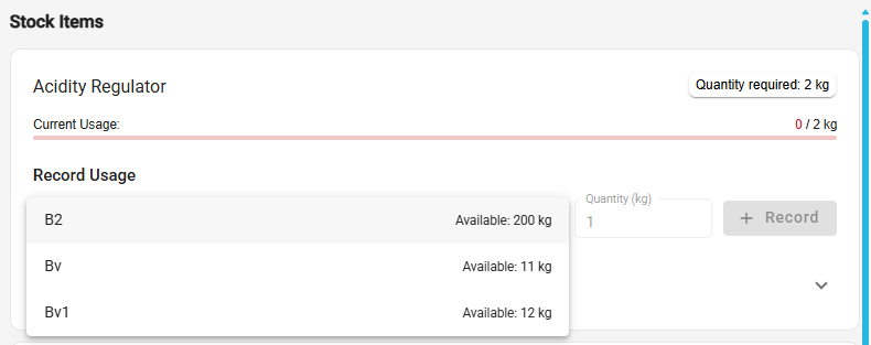 Select a stock batch and enter a quantity to consume. Click the [Add] button to add it as pending stock usage.